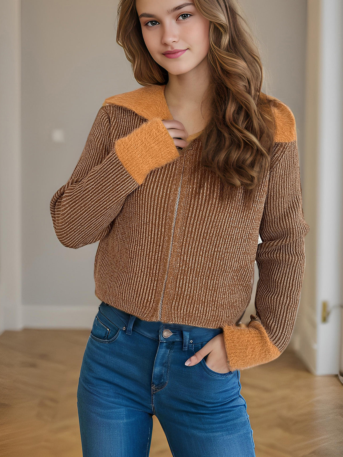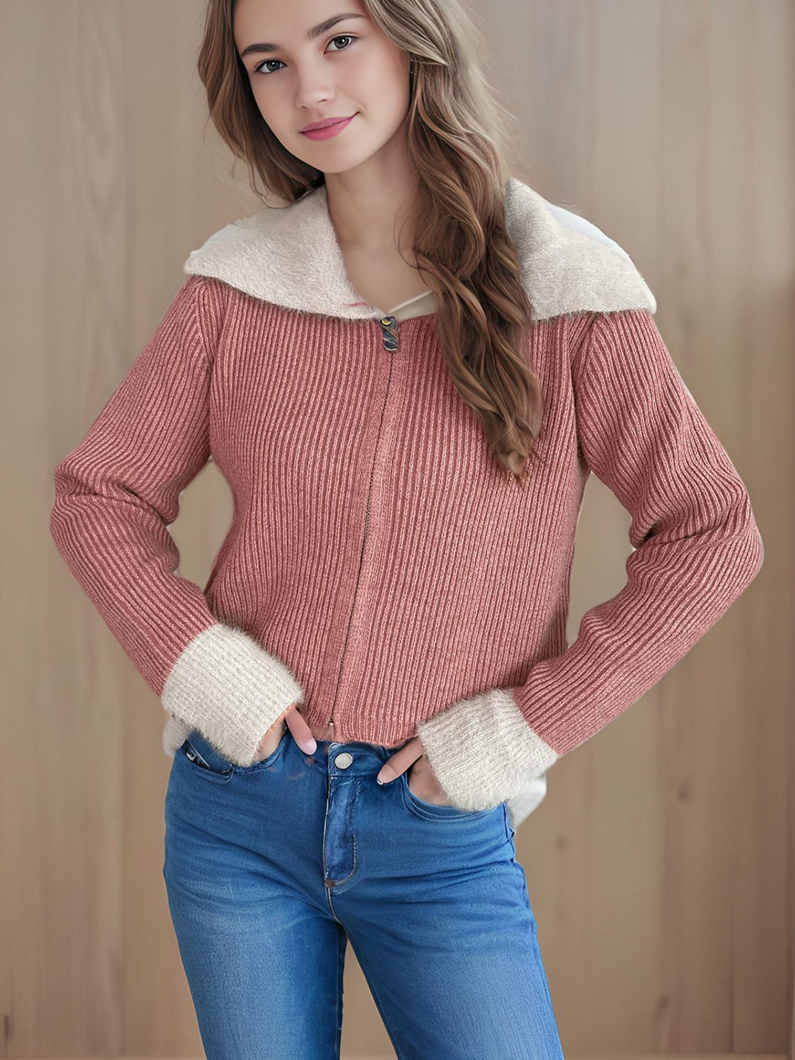 Zip Up Collared Neck Long Sleeve Cardigan